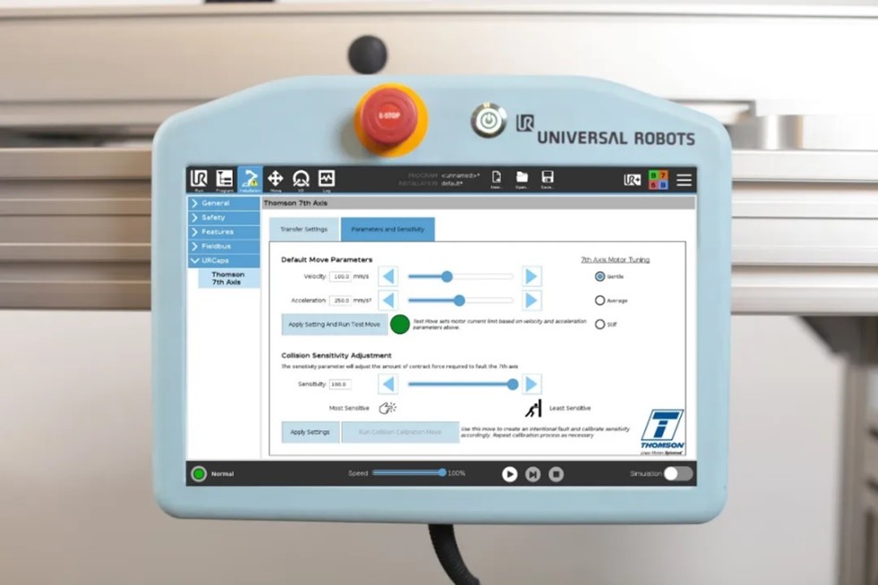 MovoTrack第七軸機器人采用雙直線模組設計,不僅提高了機器人的載荷和剛度,同時安裝簡便,只需在UR CAP操作界面上就可設置回零狀態和有效運動行程,按照實際生產需求設置速度和加速度,碰撞靈敏度,操作快捷便利。