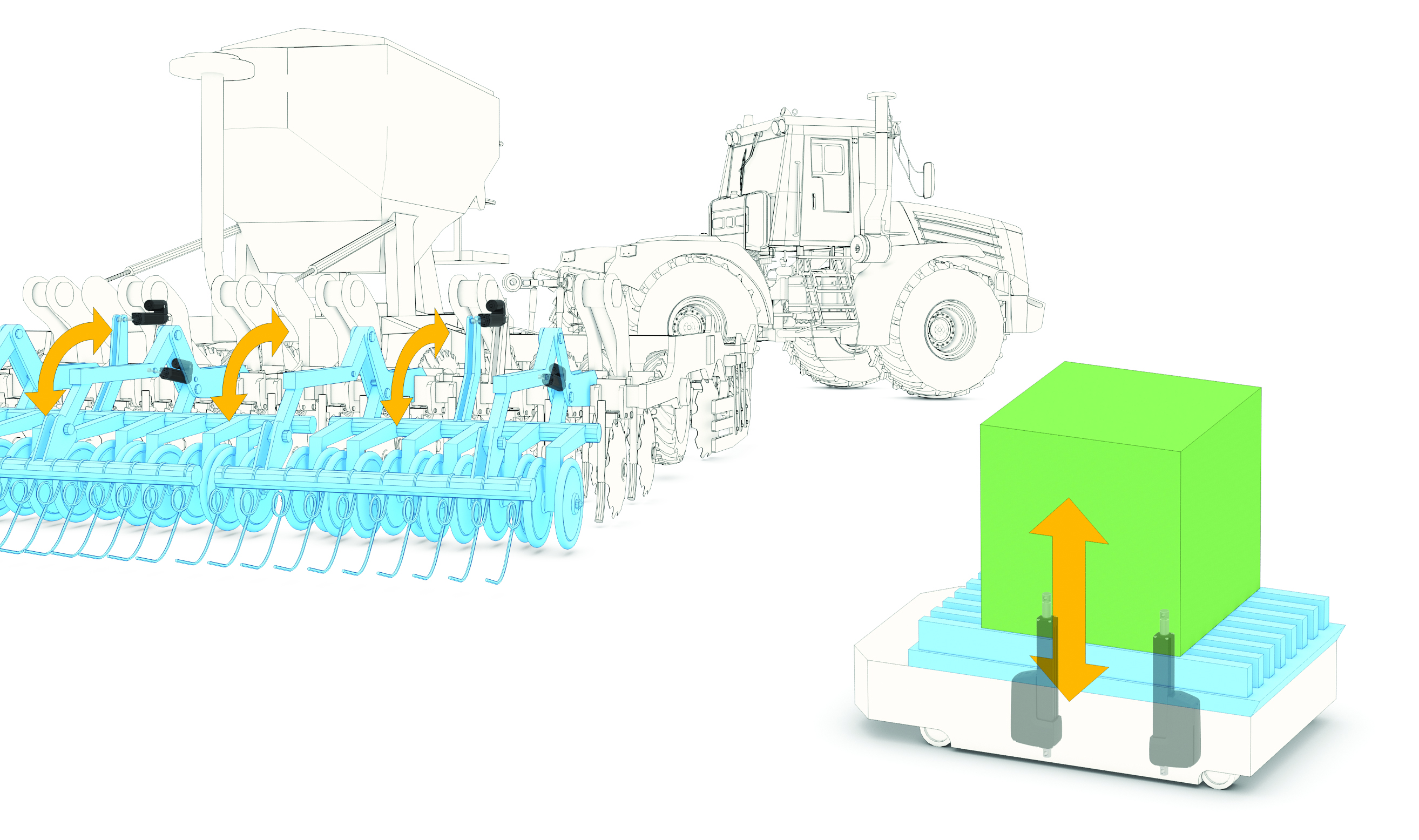 Non-contact potentiometers are ideal for applications such as mobile off-highway/agricultural (left) and factory automation/automated guided vehicles (right); in such applications, the actuators might be hidden from view and under the control of a PLC. The potentiometer can be programmed to drive the same distance and travel the same length every time.