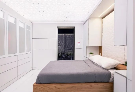 白天,客廳左側的墻壁滑入客廳,打開家庭辦公室。隔板上的屏幕可旋轉,為家庭辦公室或客廳提供電話會議和娛樂活動的空間。同樣,客廳和臥室之間的隔墻也可以移動,白天實現客廳空間的更大化,晚上實現臥室的最大化。
