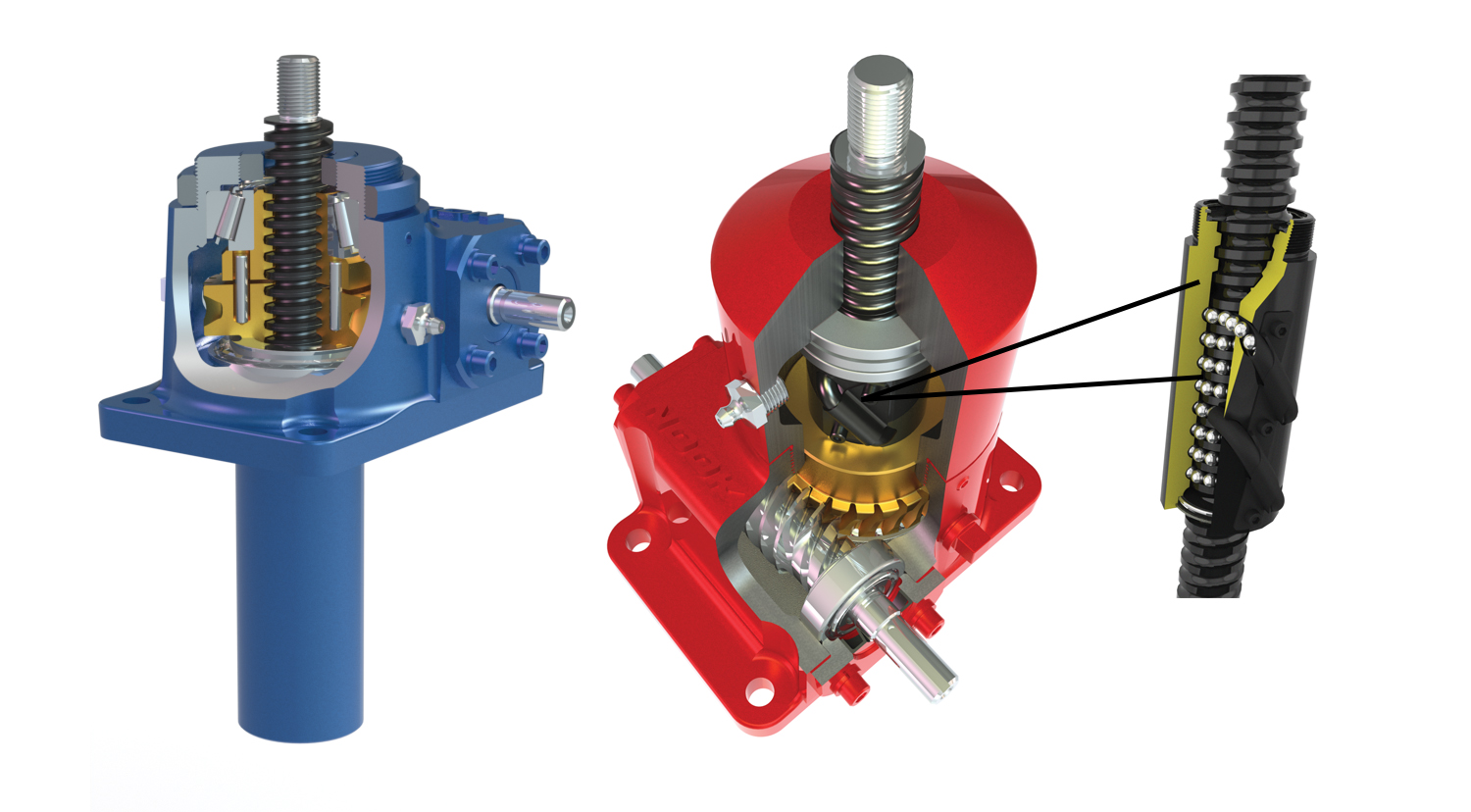 Figure 1. Machine screw jacks (left) use a threaded metal shaft and nut, which is very economical but provides high friction and low efficiency. Ball screw jacks (right) are more expensive, but their use of rolling balls reduces friction and improves efficiency.
