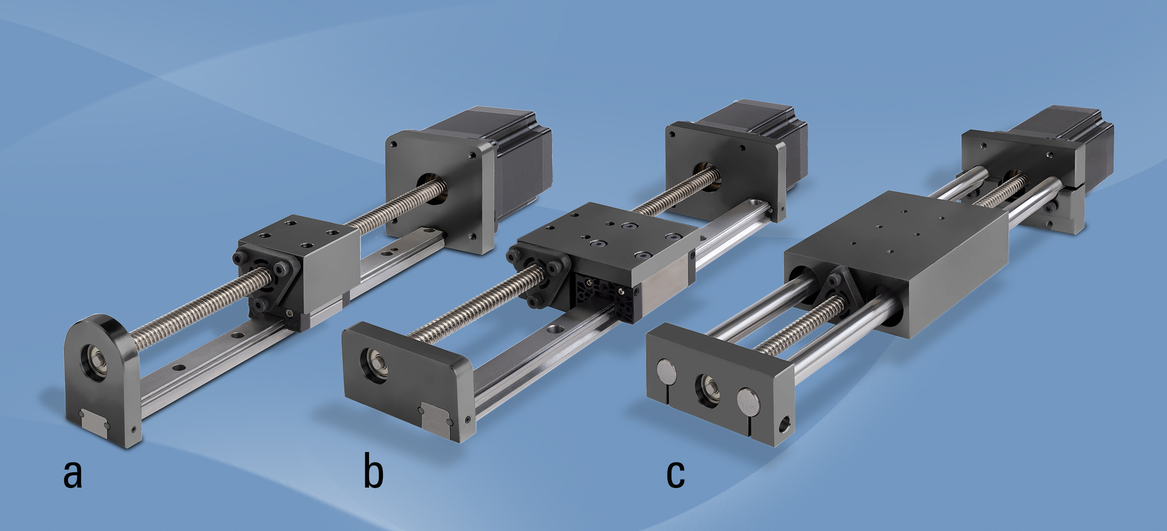 Figure 1: Standard compact linear system configurations may include the lead screw mounted vertically above profile rail (a), alongside profile rail (b) or flanked horizontally by round rails (c). Photo courtesy of Thomson Industries, Inc.